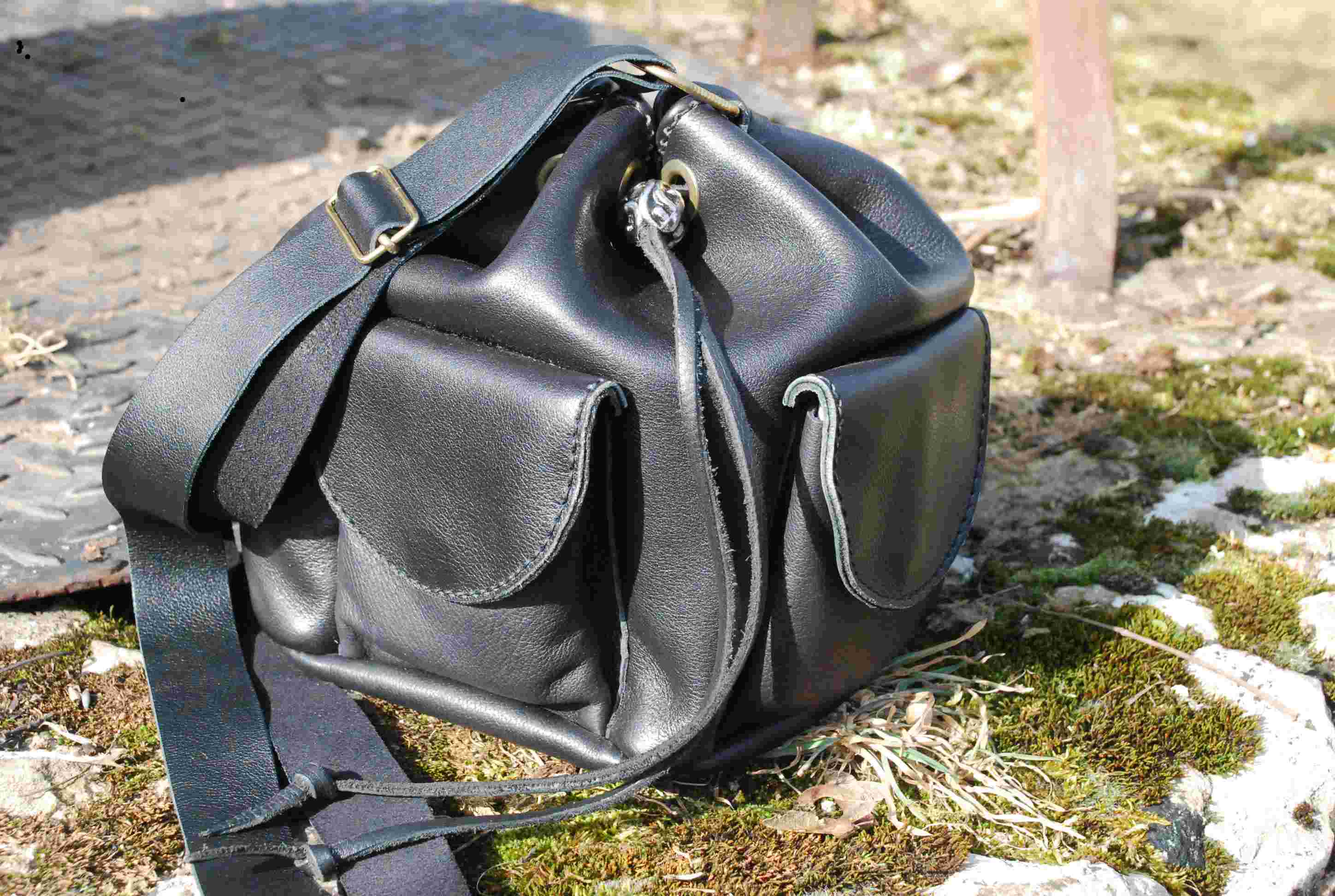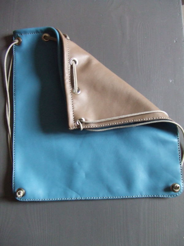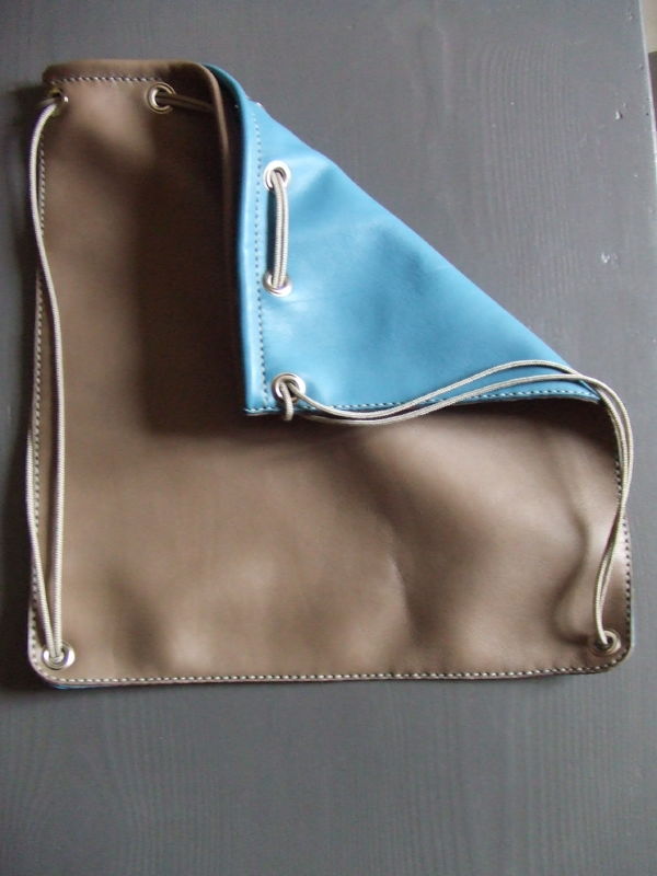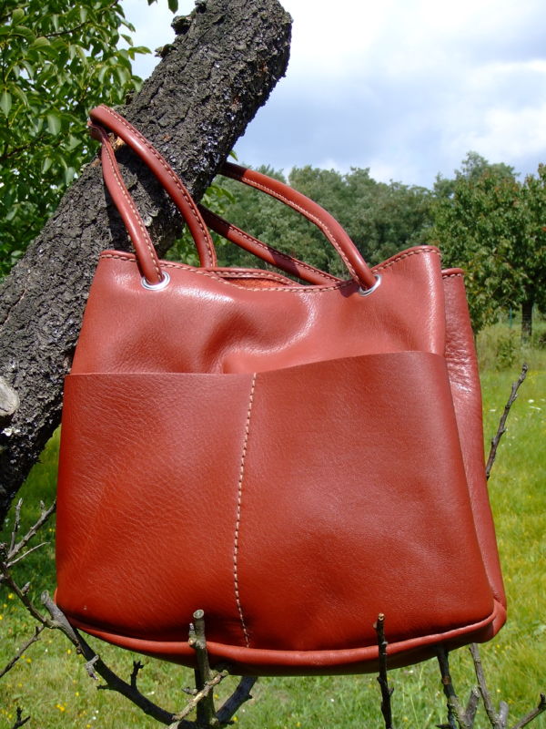 Fermeture à lanières de cuir passées dans œillets. Bandoulière réglable ou anses. Poches intérieures et extérieures.