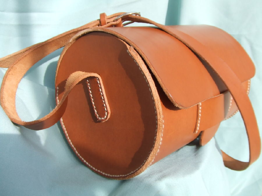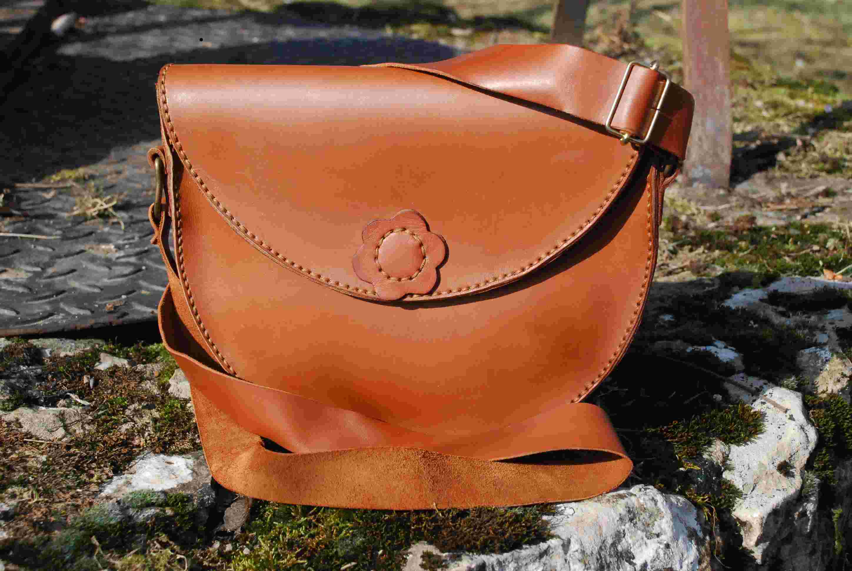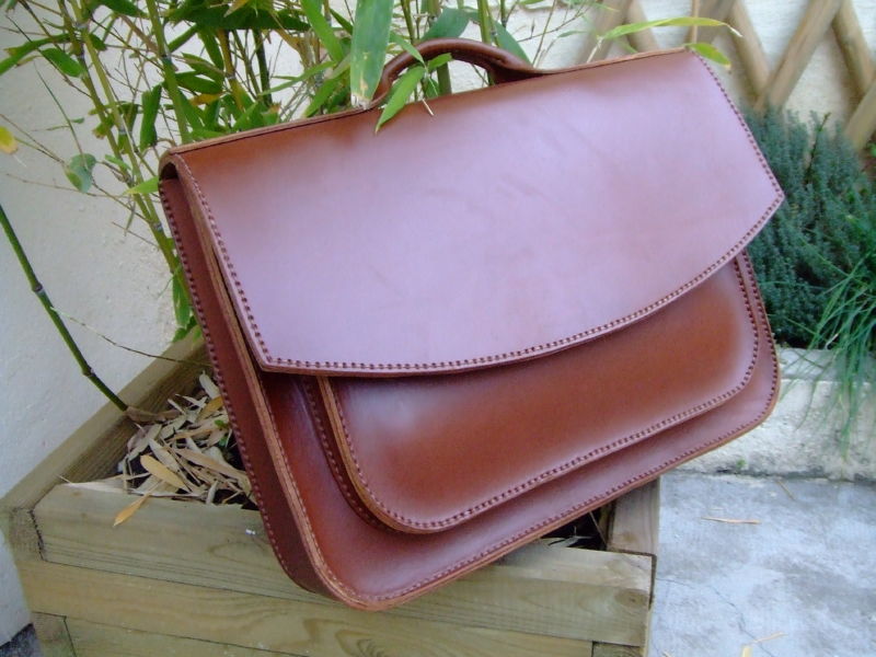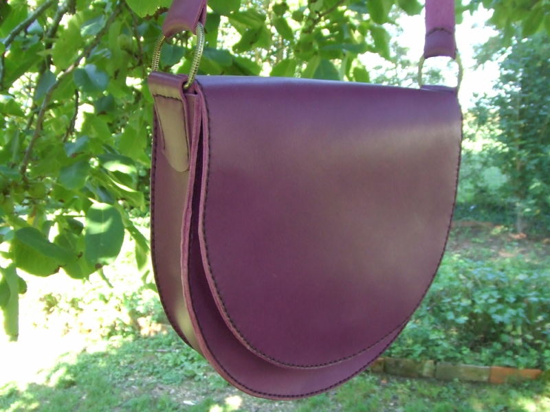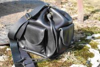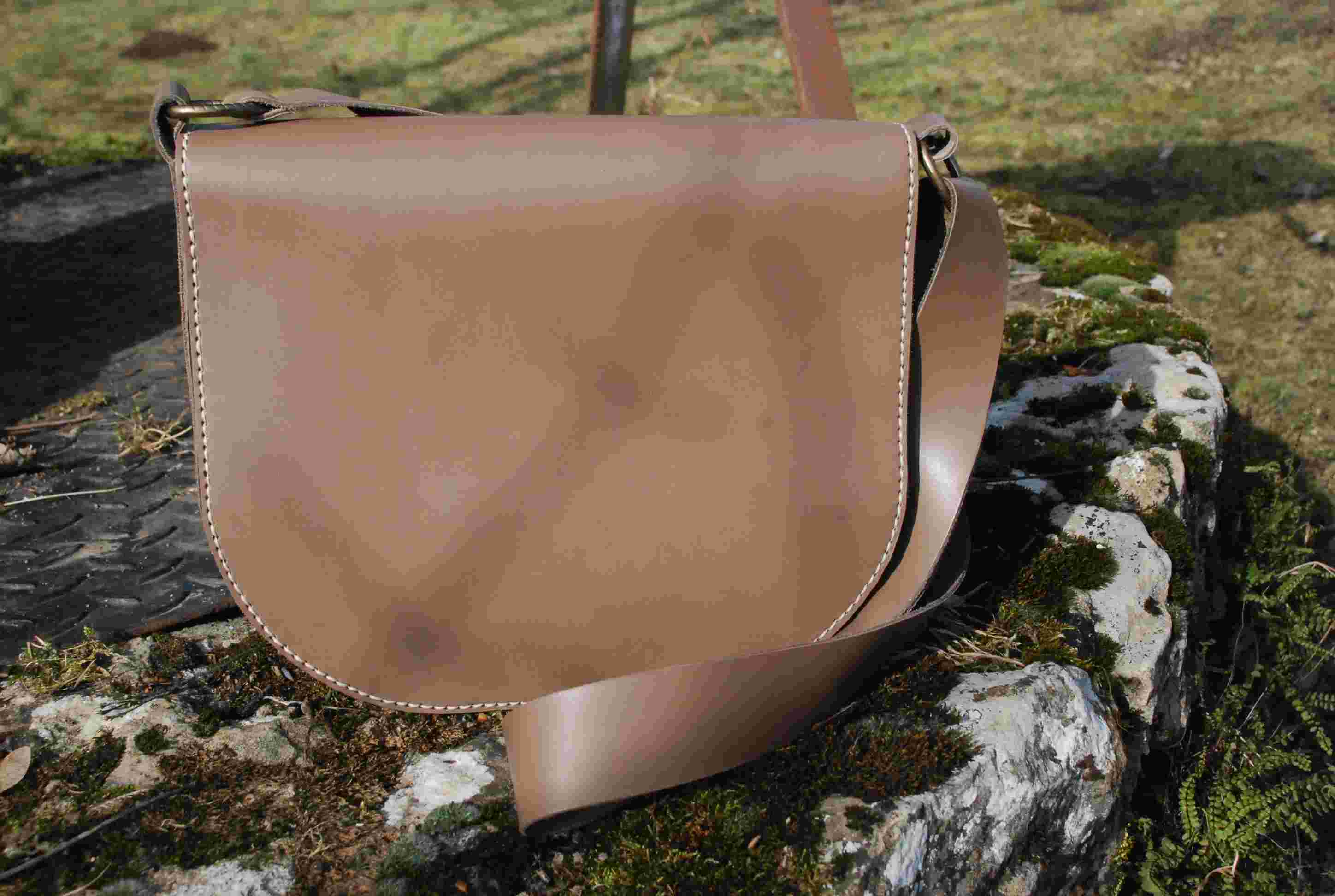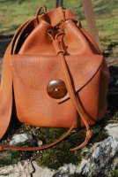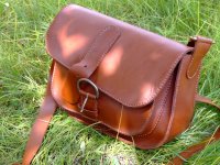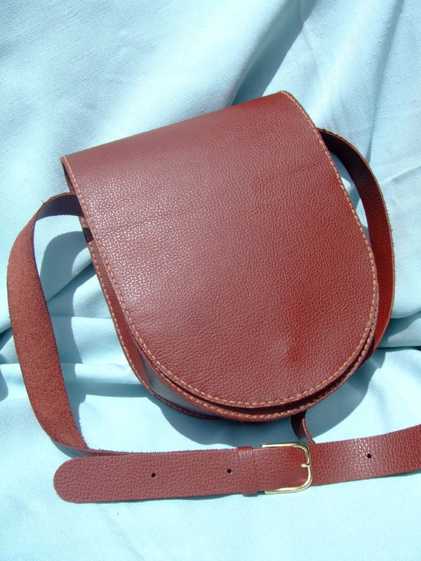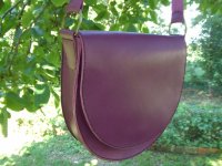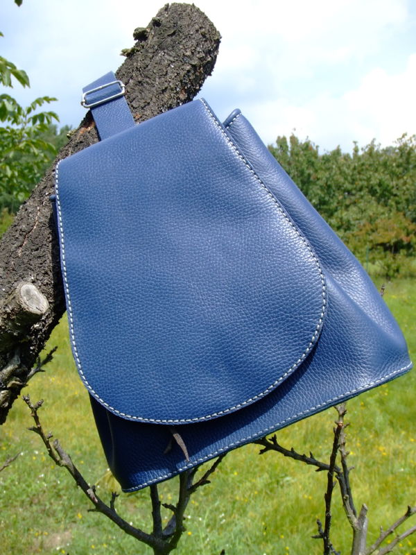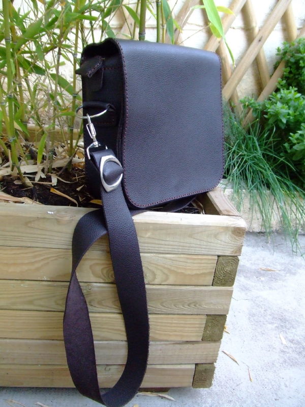 Cuir de veau souple.Besace avec grand rabat, bandoulière avec boucle à coulisse.