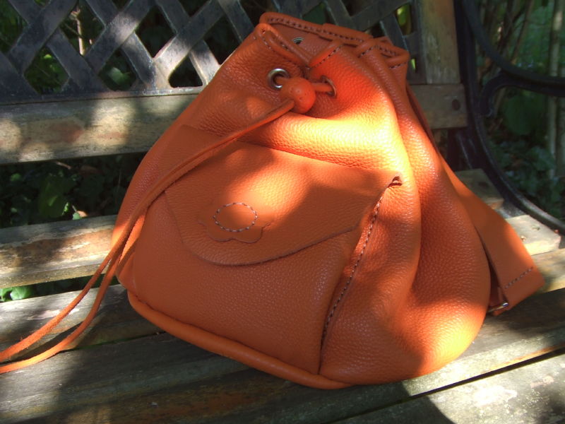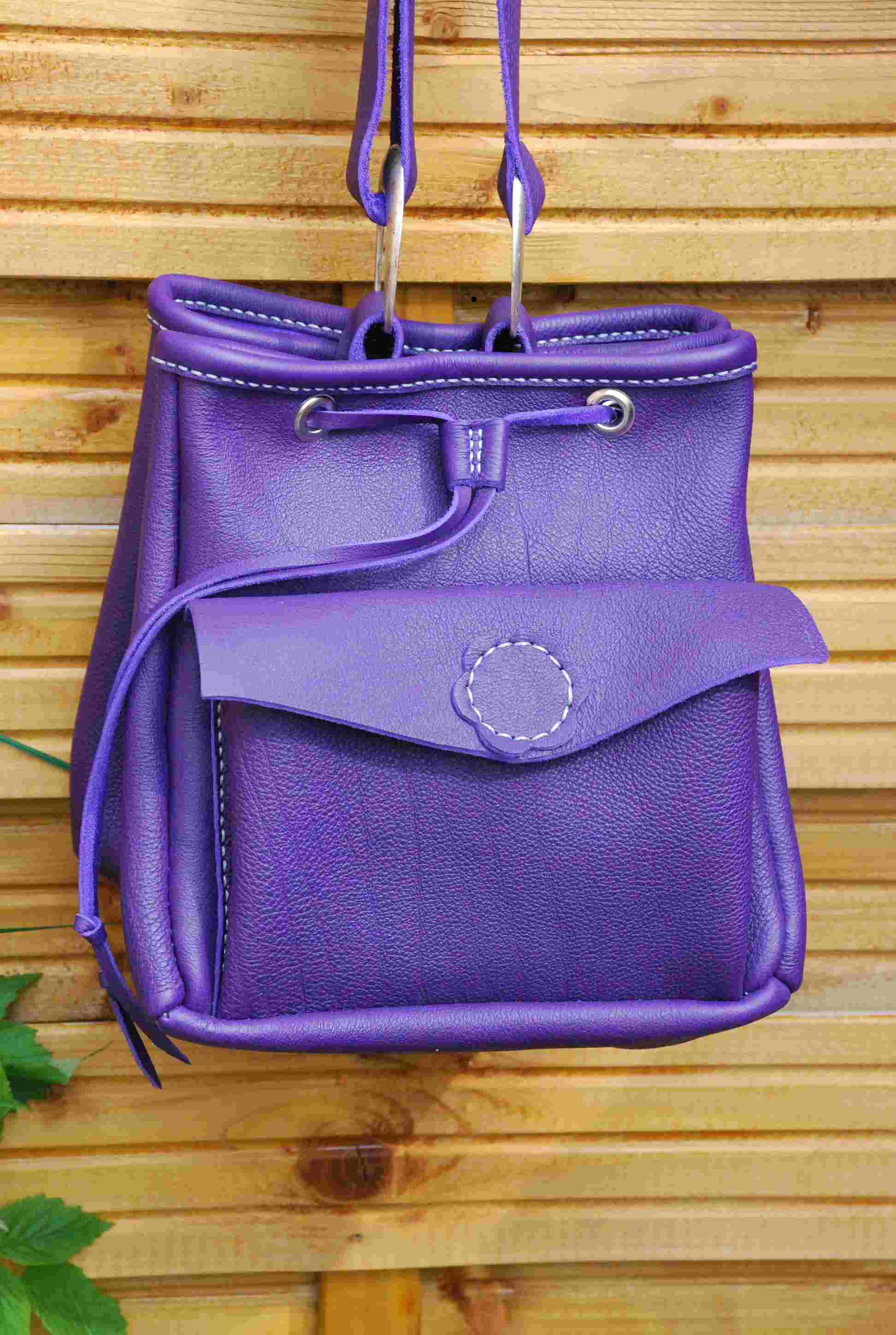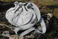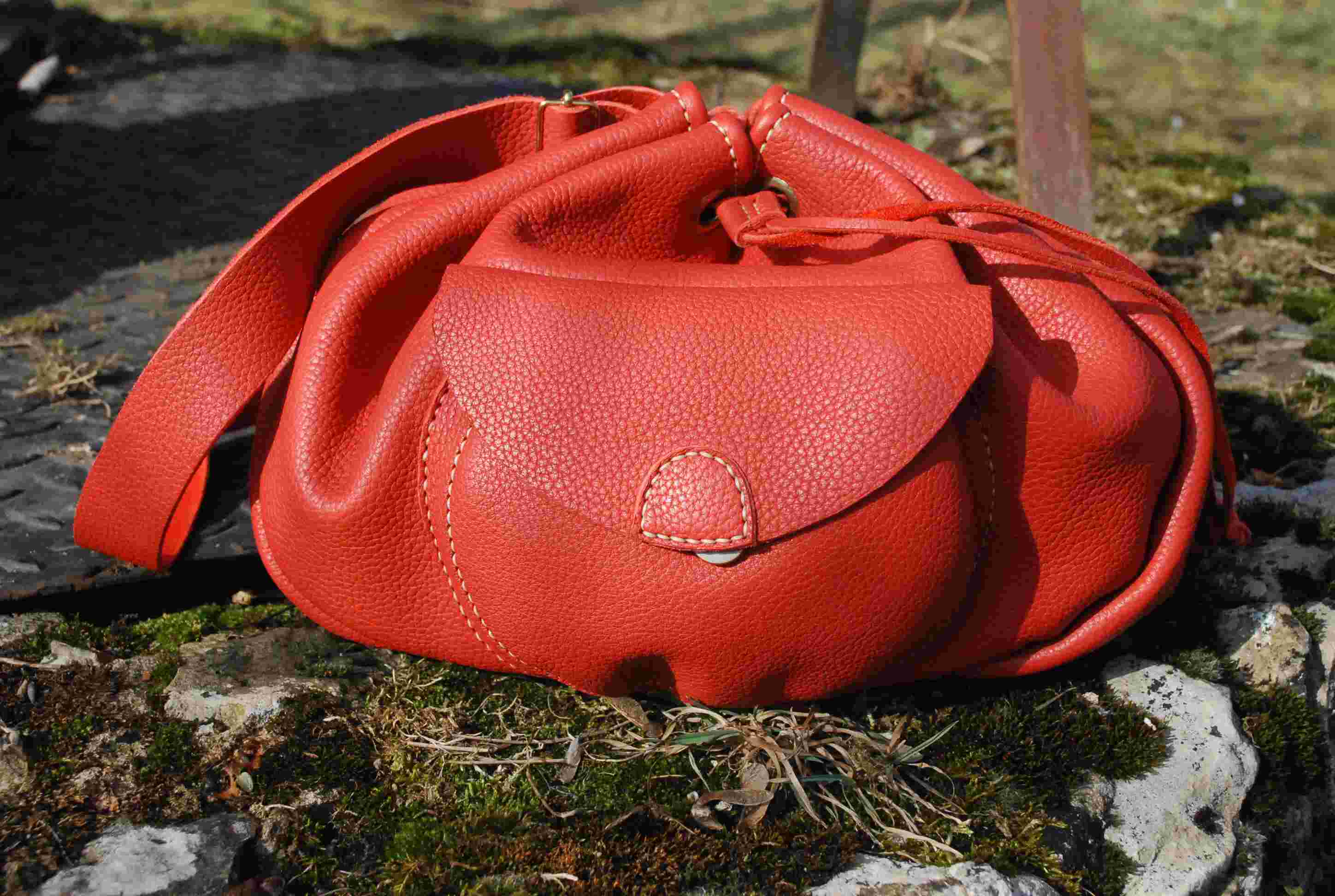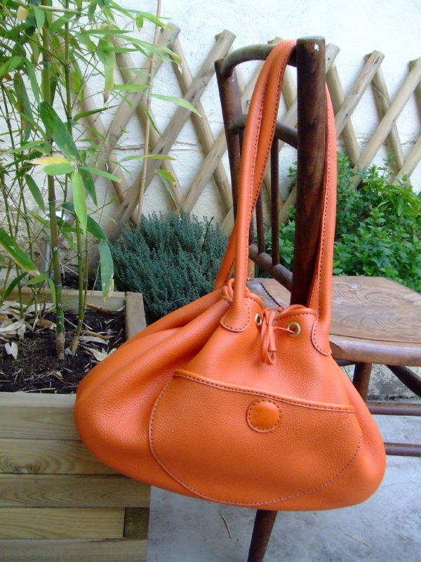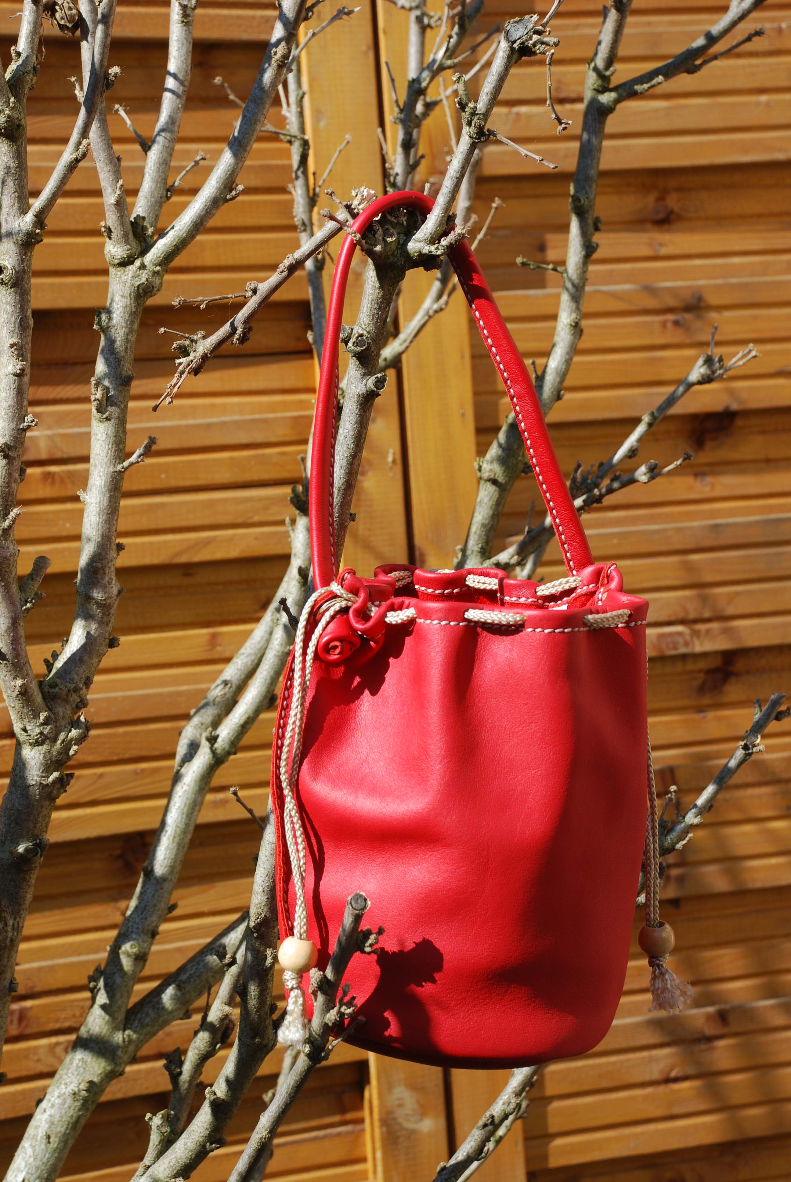 Cuir de veau et taurillon lisse.Sac seau fermé par 2 cordelettes, 1 anse d'épaule doublée attachée par 2 noeuds