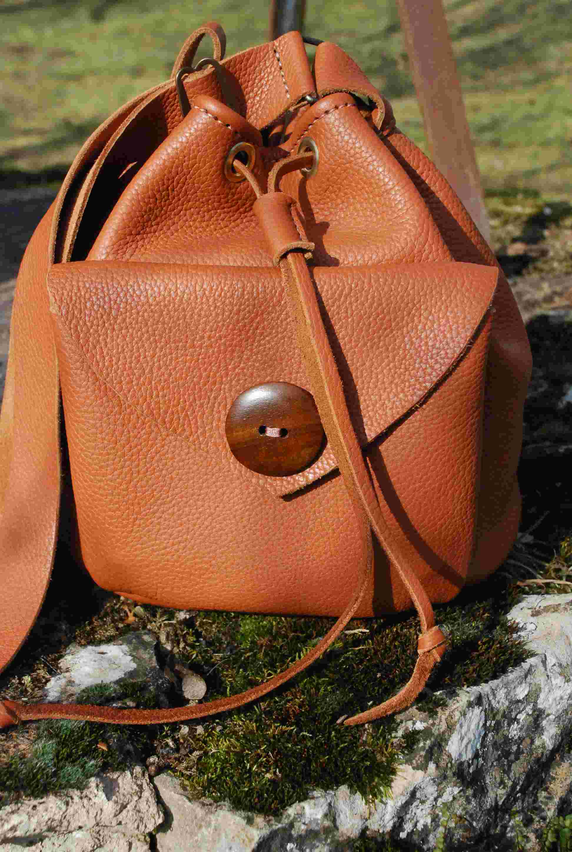 Fermeture à lanières de cuir passées dans œillets, bandoulière. 1 poche extérieure avec fermeture pression aimantée. 4 poches intérieure.s