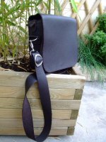 Sac carré sur base carré avec une bandoulière d'épaule amovible par deux mousquetons. 1 poche extérieure, 2 poches intérieures. Une lanière de fermeture peut servir d'anse à main.